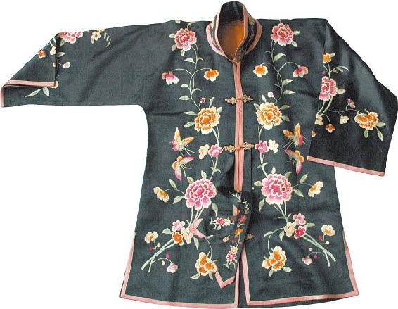 袄子有“三镶三滚”、“五镶五滚”、“七镶七滚”之别,镶滚之外,下摆与大襟上还闪烁着水钻盘的梅花、菊花。袖上另钉着名唤“阑干”的丝质花边,宽约七寸,挖空镂出福寿字样。