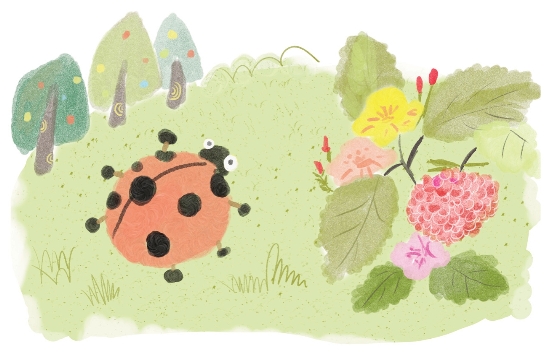 小瓢虫揉揉眼睛,翻个身,懒懒地跟刚开出花的覆盆子说: