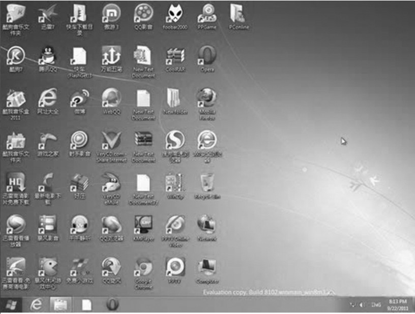 Windows XP(见图4.4)在2001年10月25日发布,2004年8月24日发布服务包2,2008年4月21日发布最新的服务包3。 微软上一款操作系统Windows Vista(开发代码为Long⁃horn)于2007年1月30日发售。 Windows Vista增加了许多功能,尤其是系统的安全性和网络管理功能,并且其拥有界面华丽的Aero Glass。 但是整体而言,其在全球市场上的口碑却并不是很好。 其后继者Windows7(见图4.5)则是于2009年10月22日发售,Windows7改善了Windows Vista为人诟病的性能问题,相较于Windows Vista,在同样的硬件环境下,Windows7的表现较Windows Vista更好。 而最新的Windows8(见图4.6)则于2012年10月26日发售。