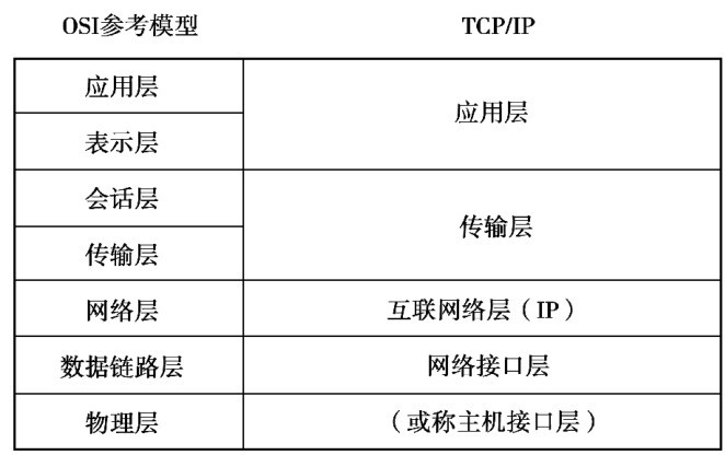 ISO/RM参考模型是国际化标准组织制订的一个网络标准,但是由于各种原因,这一标准并没有在实际中得到应用。 而TCP/IP模型发展于20世纪70年代,是一个得到广泛应用的协议簇,也是现在事实上的网络标准。 TCP/IP模型把网络分为了4个层次,即网络接口层、互联网络层、传输层和应用层。这两种标准的对应关系如图5.6所示。