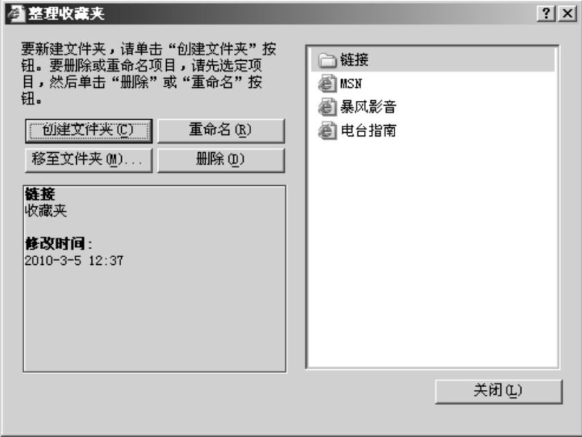 对于用户经常使用或者感兴趣的网站,用户可以将其添加到收藏夹中,方法是选择“收藏”→“添加到收藏夹”命令,然后在弹出的对话框中输入网页的名称,单击“添加”按钮即可。当收藏夹中的站点或者网页过多时,就需要整理收藏夹,选择“收藏”→“整理收藏夹”命令,弹出“整理收藏夹”对话框,此时可以完成收藏夹中数据的整理,如图6.12所示。