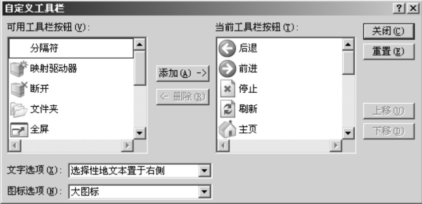 用户可以自定义工具栏上的按钮图标。启动IE并选择“查看”→“工具栏”→“自定义”命令,弹出“自定义工具栏”对话框,如图6.11所示。 然后用户就可以根据自己的需要对IE工具栏进行调整了。
