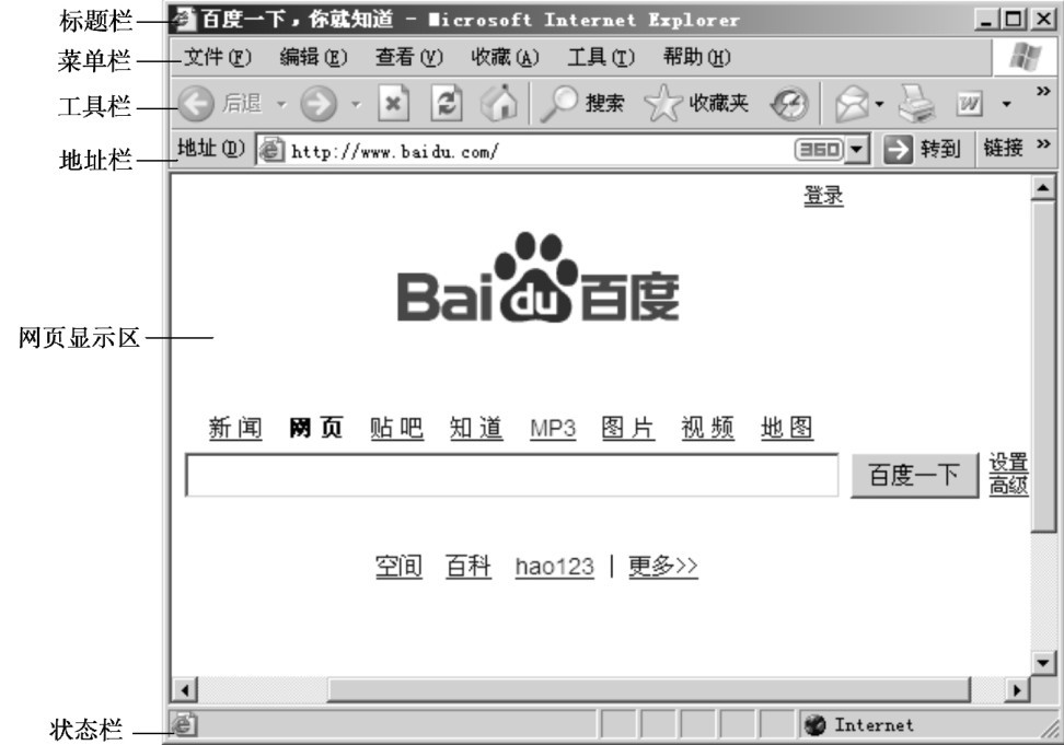 浏览器窗口主要由标题栏、菜单栏、工具栏、地址栏、网页显示区和状态栏等组成,如图6.9所示。