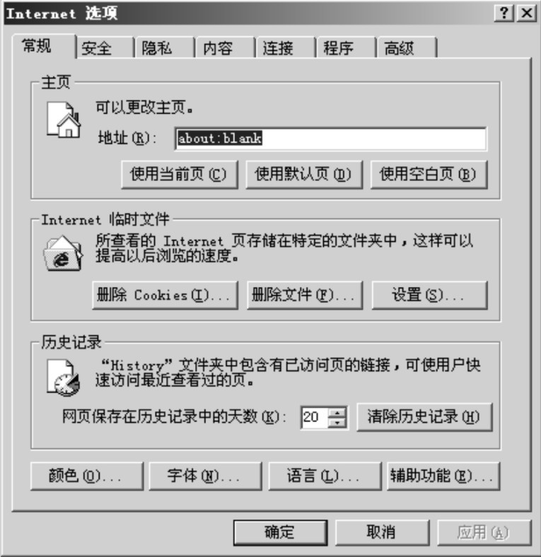 用户访问过的网页,IE会自动将它们保存在临时文件夹中。 如果想清除这些文件,只需选择“查看”→“Internet选项”命令,然后在弹出的对话框中选择“常规”选项卡,单击“Internet临时文件”选项组中的“删除文件”按钮即可。 临时文件被删除后,将不能进行脱机浏览。