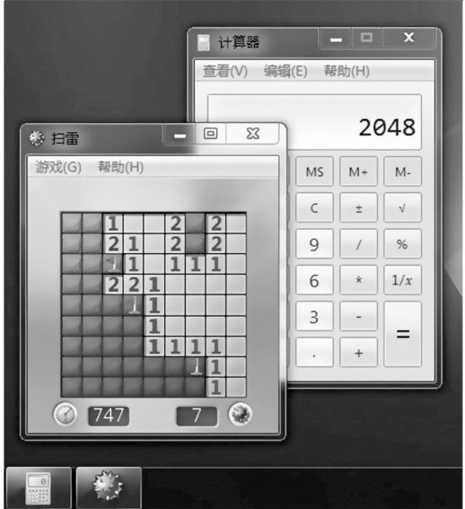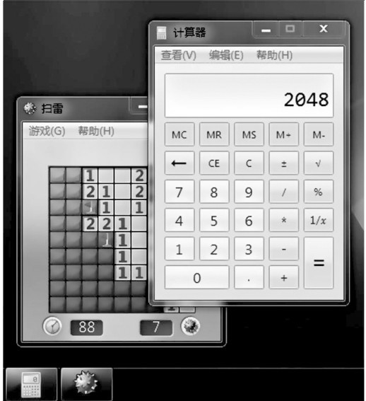 如果一次打开多个程序或文件,则这些打开的窗口将快速堆叠在桌面上。 这种情况下使用任务栏会很方便。 无论何时打开程序、文件夹或文件,Windows都会在任务栏上创建对应的按钮。 按钮会显示为已打开程序的图标。 如图7.15所示,打开了“计算器”和“扫雷”两个程序,每个程序在任务栏上都有自己的按钮。 其中,“计算器”的任务栏按钮是高亮突出显示的,这表示“计算器”是“活动”窗口,意味着它位于其他打开窗口的前面(即当前窗口),可以与用户进行交互。