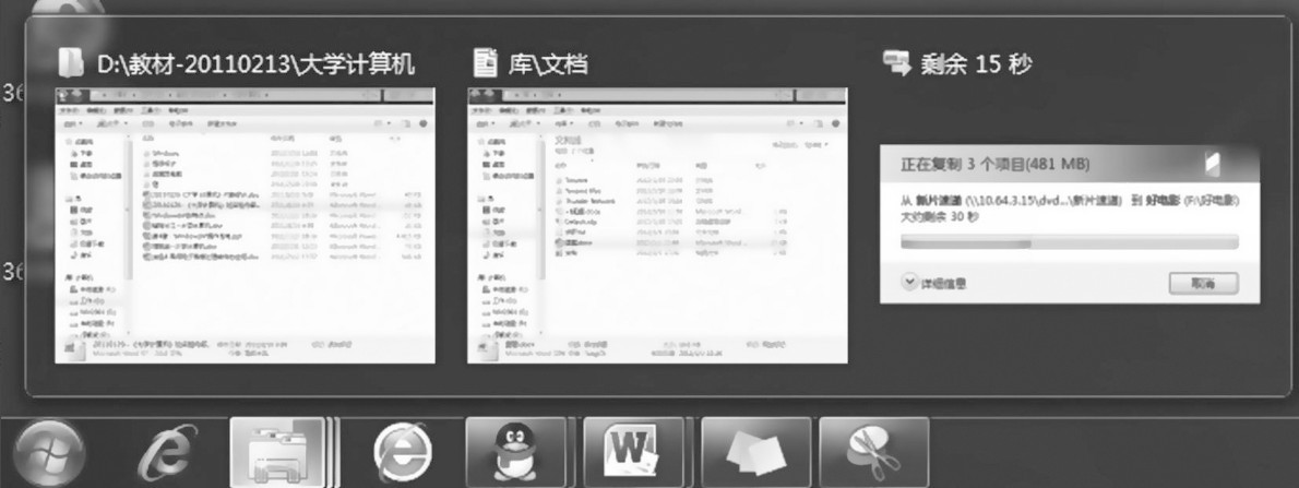 将鼠标指针移向任务栏按钮时,会出现一个小图片,上面显示的缩小版的相应窗口,称为“预览”或“缩略图”。 此预览非常有用。 如果其中一个窗口正在播放视频或动画,则会在预览中看到它正在播放(仅当Aero可在用户的计算机上运行且在运行Windows主题时,才可以查看缩略图)。 如图7.19所示为任务栏“资源管理器”按钮的缩略图,其中第3个缩略图是正在进行中的文件复制。