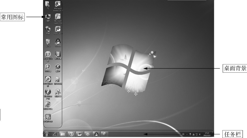 桌面是打开计算机并登录到Windows7之后看到的主屏幕区域,用于显示屏幕工作区域上的窗口、图标、菜单和对话框。 Windows桌面主要由图标、任务栏和桌面背景等几个部分组成,如图7.8所示。