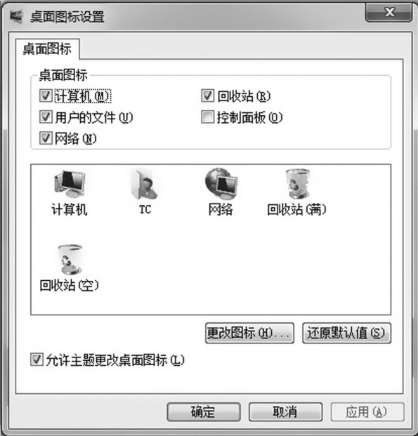 ②在“个性化”窗口左窗格中单击“更改桌面图标”,打开“桌面图标设置”对话框,如图7.11所示。