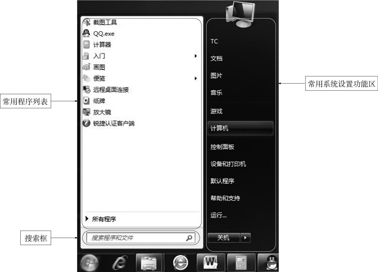 任务栏是位于屏幕底部的水平长条。 与桌面不同的是,桌面可以被打开的窗口覆盖,而任务栏几乎始终可见。 任务栏提供了整理所有窗口的方式,每个窗口都在任务栏上具有相应的按钮,任务栏有4个主要部分,如图7.14所示: