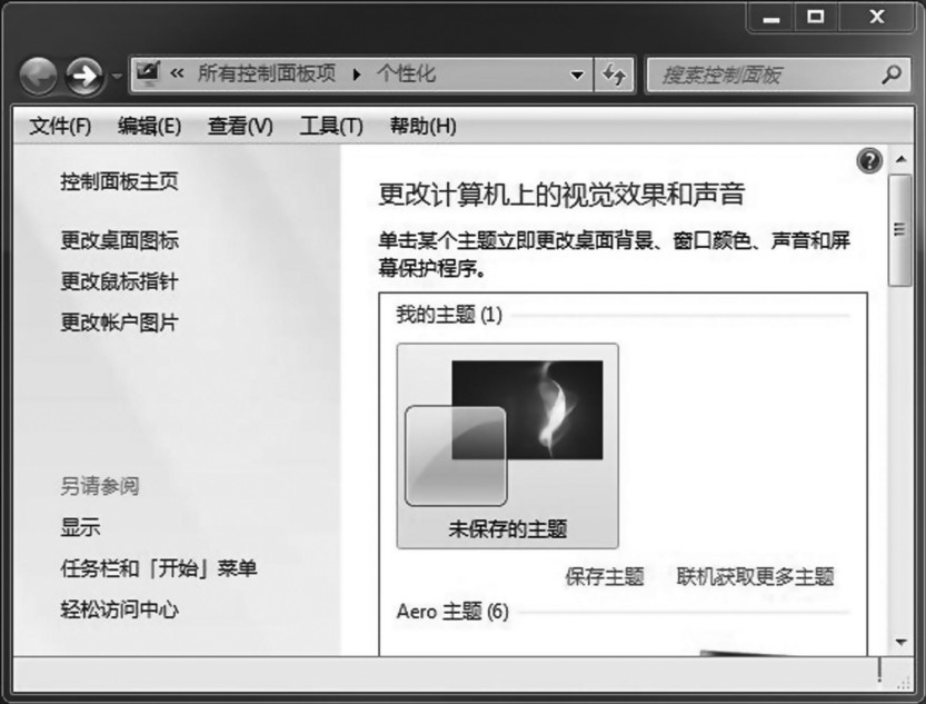 ①右键单击桌面上的空白区域打开快捷菜单,然后单击“个性化”菜单项,打开“个性化”窗口,如图7.10所示。