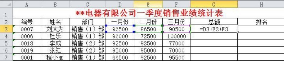 步骤3:选定G3单元格,利用填充柄向下填充G3单元格中的公式,可得到后面员工的销售总额,如图9.20所示。 该填充利用的是相对引用。
