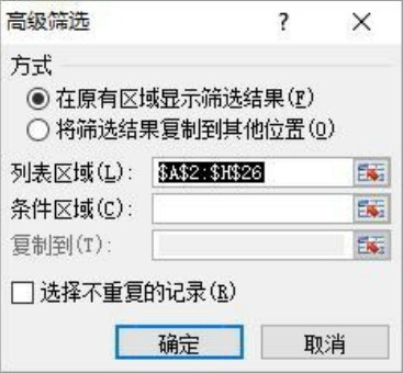 ,选定列表区域Sheet1!﹩A﹩2:﹩H﹩26,然后单击“条件区域”右侧的压缩对话框按钮