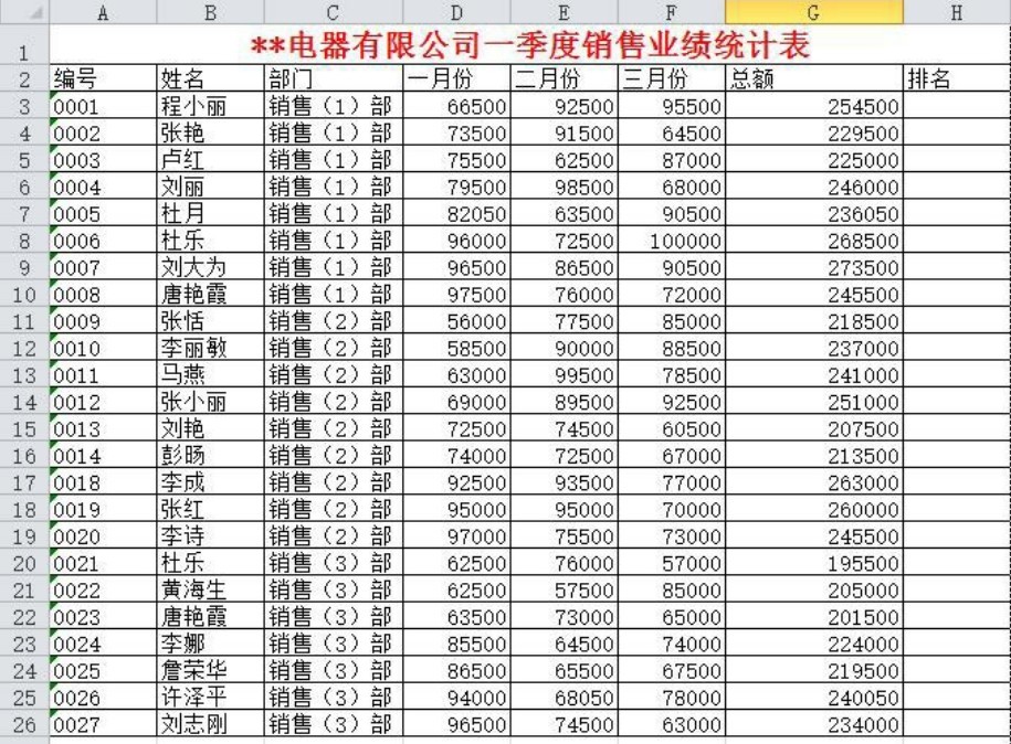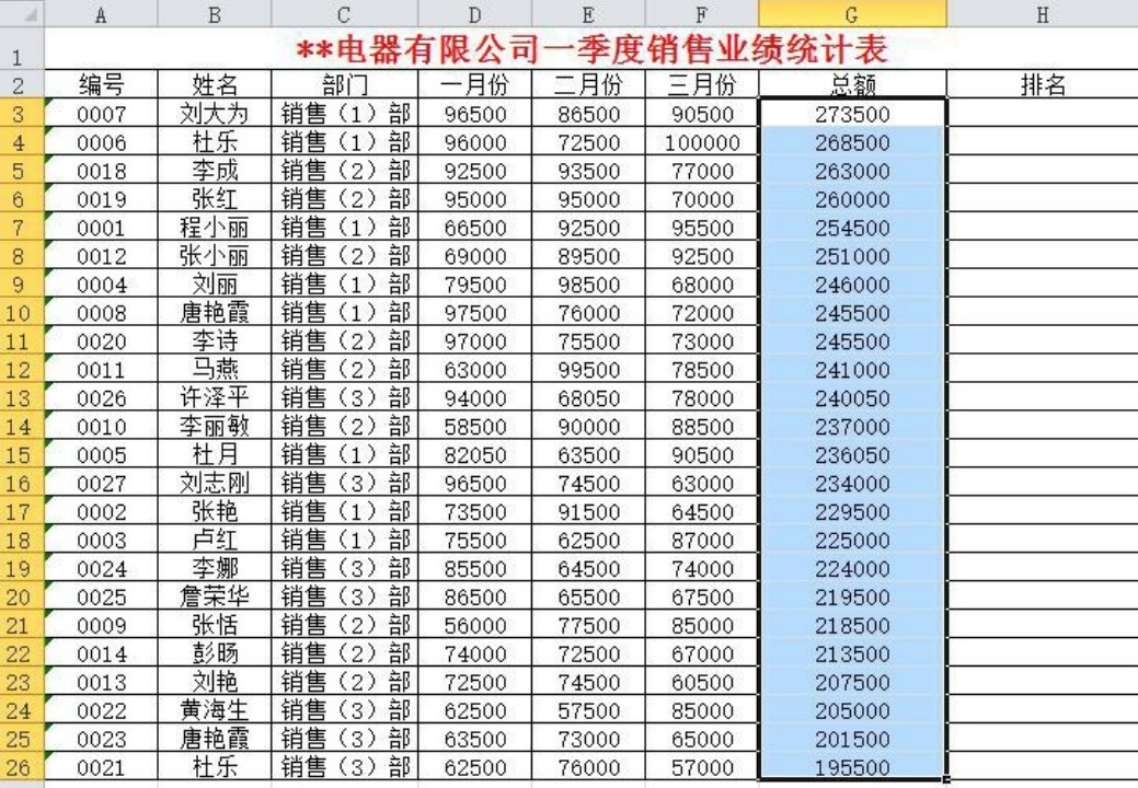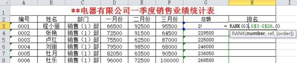 通过上述的分析可得出第一位员工排名的公式为= RANK(G3,G﹩3:G﹩26,0)。