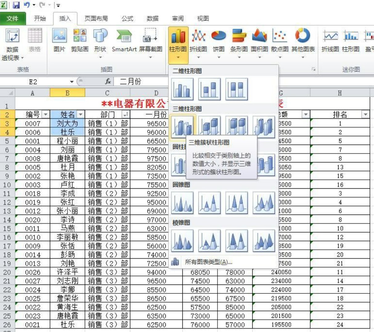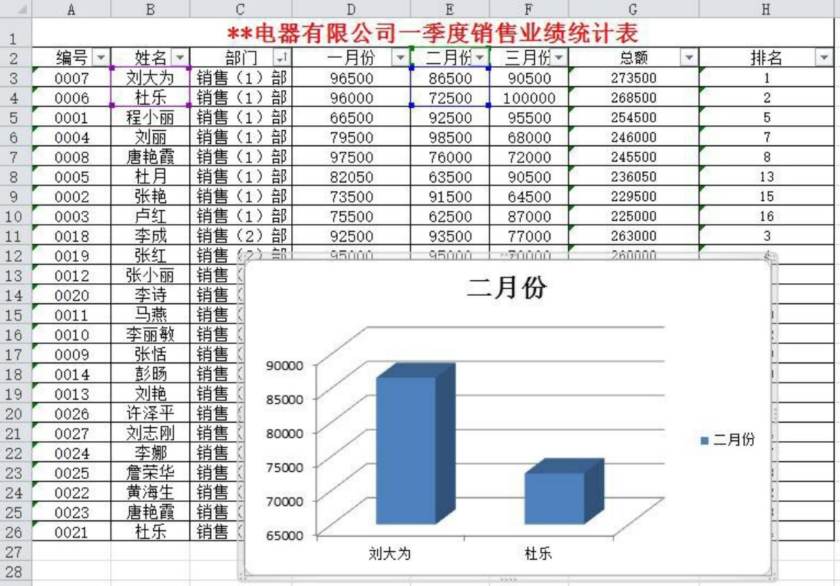 现在创建“销售业绩统计表”前两位员工“总额”的嵌入式图表。 具体操作步骤如下: