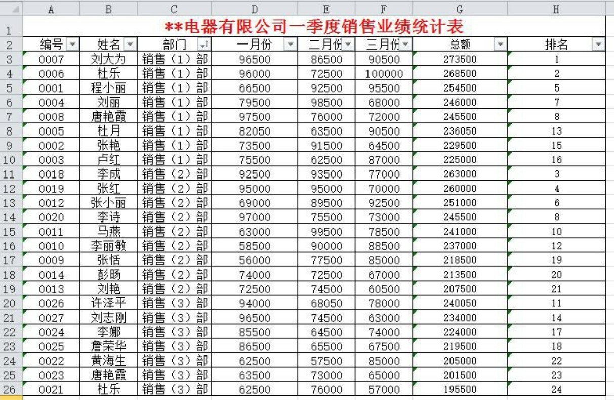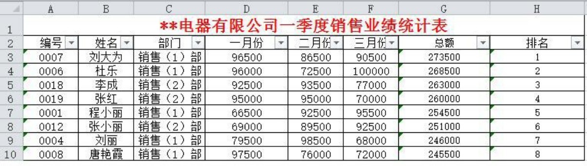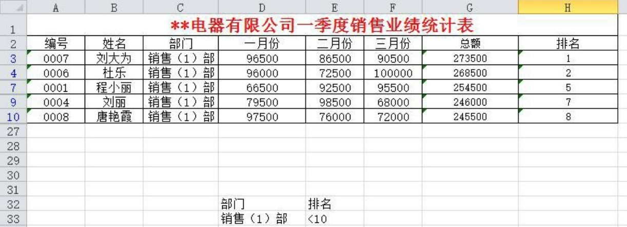 例如:使用“高级筛选”筛选出“销售(1)部”且“销售排名”在“前10”的员工记录。 操作步骤如下:
