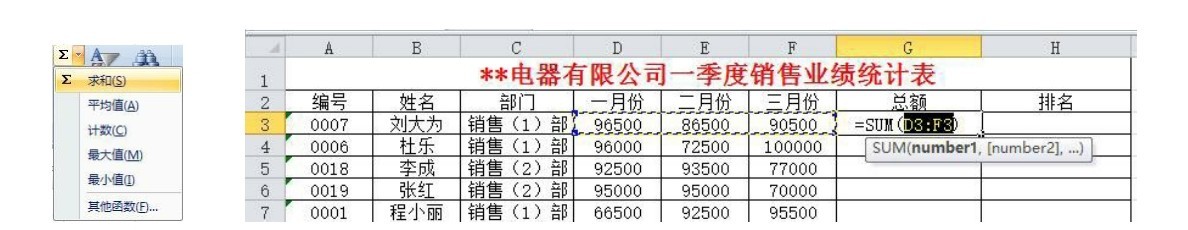 按钮,单击该按钮,弹出的下拉菜单如图9.19左图所示。 执行求和命令,此时在G3单元格中显示出总额的计算公式 =SUM(D3:F3),如图9.22右图所示,按回车键即可得到与图9.18所示的相同结果。