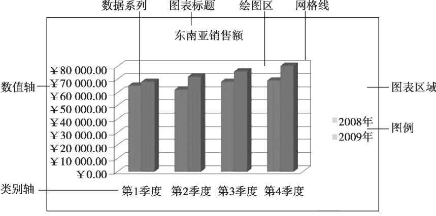 Excel2010自带有各种各样的图表,如柱形图、折线图、饼图、条形图、面积图、散点图等,各种图表各有优点,适用于不同的场合。 图表的组成如图9.42所示。