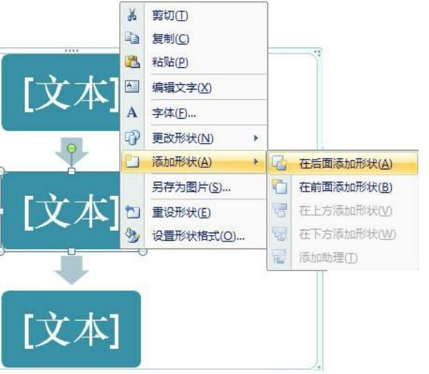 步骤3:选定其中一个文本框,单击右键,弹出快捷菜单,从中选择“添加形状”→“在后面添加形状”,如图10.21所示,即可添加另外一个文本框。
