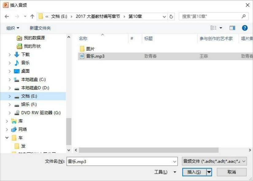 ,在下拉菜单中选择“文件中的声音”,打开“插入声音”对话框,选择声音所在的文件夹,如图10.9所示。