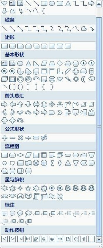 步骤2:在“插入”选项卡“插图”组中,单击“形状”按钮弹出其下拉列表,如图10.37所示。 在该下拉列表中,图形都是易理解的符号,将鼠标指针指向任意按钮时,将显示该按钮的名称,如“自定义”“第一张”“帮助”“信息”“后退或前一项”“前进或下一项”“开始”“结束”“上一张”“文档”“声音”和“影片”。