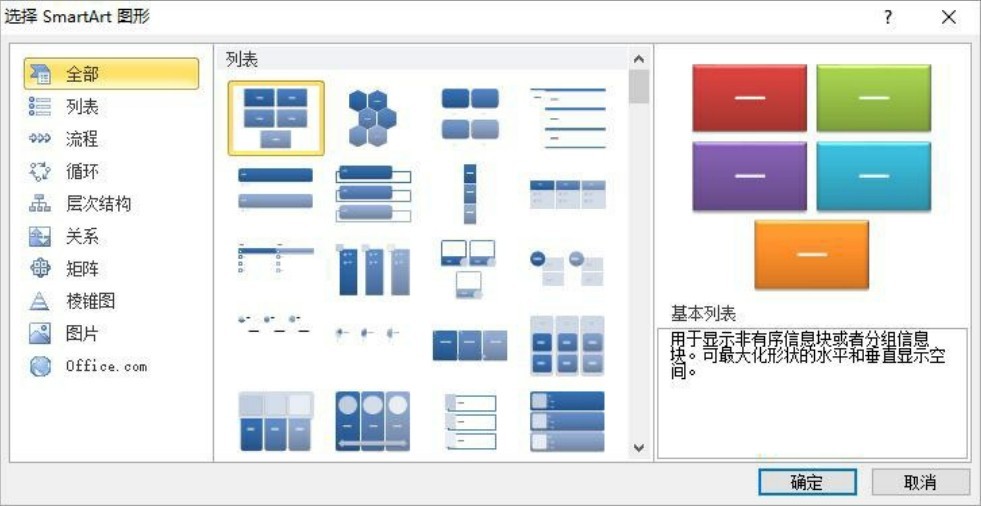 步骤1:在“插入”选项卡“插图”选项区中单击“Smart Art”按钮,弹出“选择Smart Art图形”对话框,如图10.19所示。