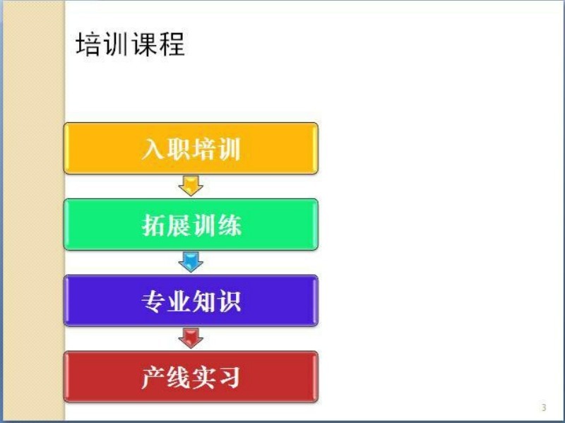 利用前面讲述的方法添加第三张幻灯片,选择“标题和内容”版式,添加标题内容为“培训课程”。