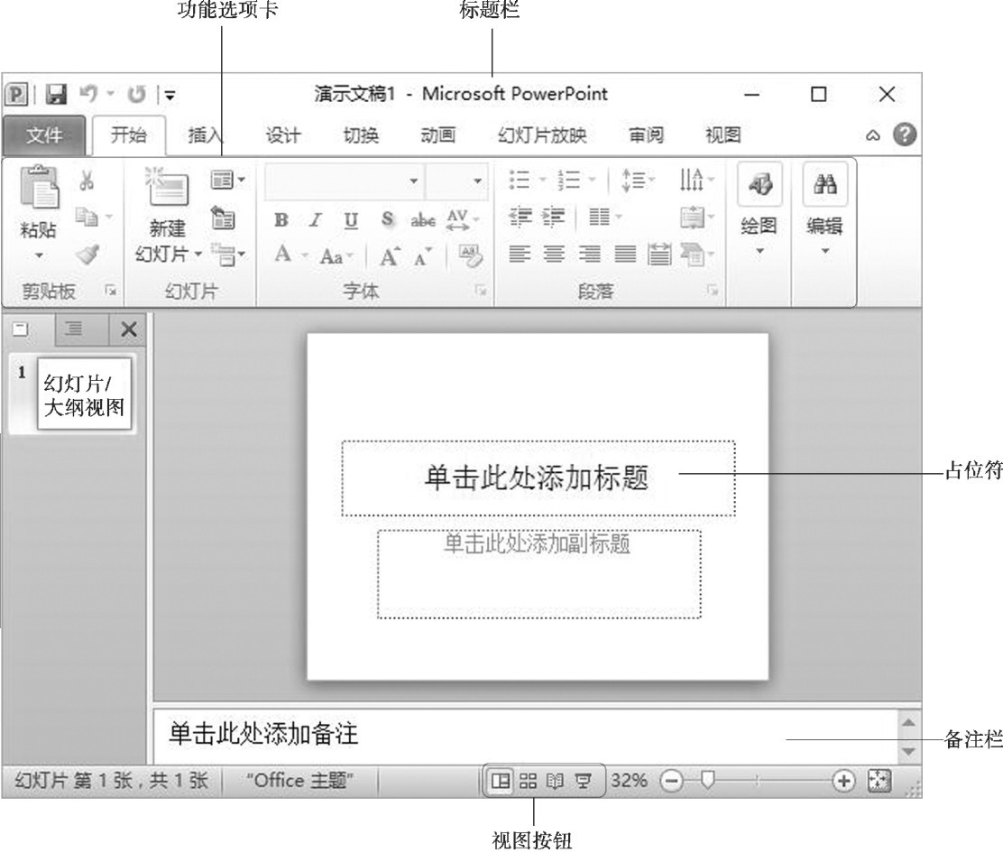 按钮,即可创建一个如图10.2所示的空白演示文稿。