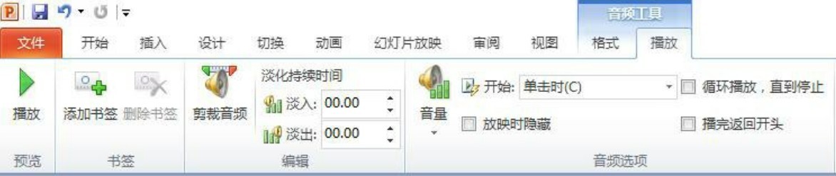 若要对声音文件进行设置,可选择声音文件图标,利用在功能区中出现的“音频工具选项”选项卡,如图10.10所示。