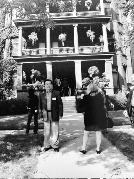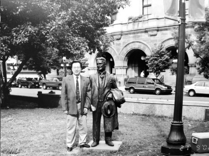 与作者塑像合影(2002年,明尼苏达州圣保罗市中心广场)