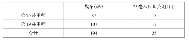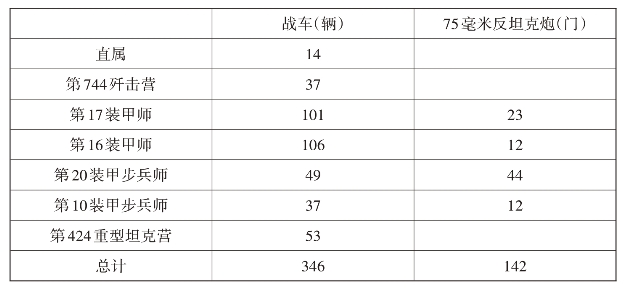 防守正面163公里。99064人(步兵16025人),装备135辆战车(90辆可用),240门75毫米反坦克炮,17门88毫米反坦克炮,野战炮279门