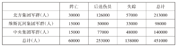 德军的人力损失方面,有一份战时粗略估计显示,1945 年1—2 月间,东线北部和中部的3个集团军群一共损失了45.1万人。其具体构成为:[58]