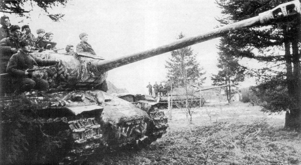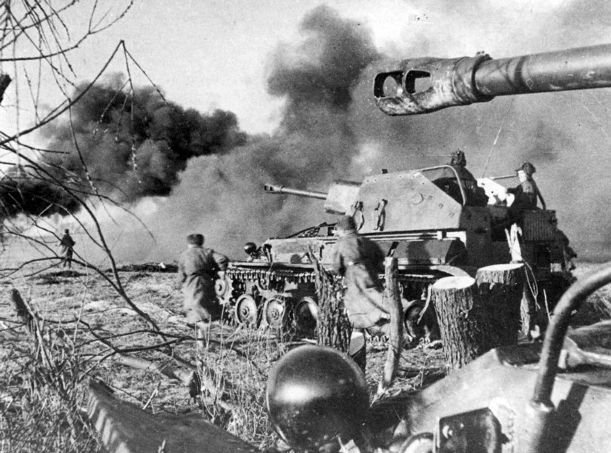 1 月攻势中的Su-100 自行火炮,背景可以看到T-34/85 坦克纵队。它们都隶属于乌克兰第1 方面军。值得注意的是,Su-100上搭载的一个苏联步兵拿着缴获的德军44型突击步枪