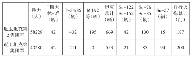 白俄罗斯第1 方面军和乌克兰第1 方面军(15 个集团军,4 个坦克集团军,2 个航空集团军,5个独立坦克军,1个机械化军,3个骑兵军)