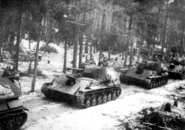 1945年1月,在波兰行进中的苏军Su-76自行火炮连