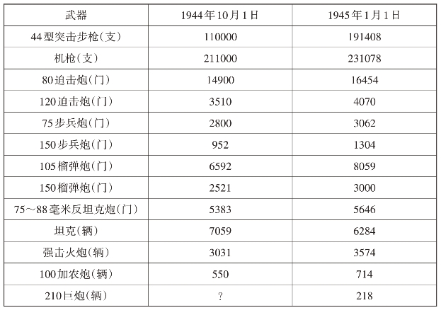 一个流传甚广的说法是,为了实施阿登战役,希特勒似乎把德国装甲部队主力配置到了西线。但这并非事实。在1944年11月初,东线德军拥有各种战车5473辆(包括在修和调配中的装备)。而同期西线只有1998辆,仅相当于东线的三分之一多。12 月30 日,部署在东线的主力型号坦克(指“虎”、“黑豹”、四号坦克这三种型号。不含三号等旧型号)共有1755 辆,同期西线只有1117辆。东线的强击火炮数量更是比西线多几倍。不算修理中的装备,东线在12月31 日共有2932 辆战车可随时投入战斗,包括1079 辆坦克和1853 辆强击火炮。[21]另一方面,德国全军的坦克总数却在1944 年最后两个月从7059 辆减少到6284 辆。与此同时,德国陆军的其他武器装备,从轻武器到火炮、迫击炮、强击火炮,数量大都有所增加。尤其是新式的44式突击步枪从11万支增加到19万支。这种武器将在战后得到大发展,取代传统步枪和冲锋枪的地位。