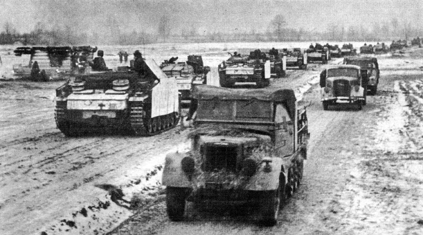 正向前线开进的德国强击火炮部队。1945 年初,东线很多步兵师也装备了强击火炮,以强化一线阵地的反坦克防御