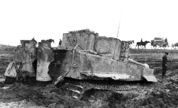 一辆陷入泥泞无法自拔的“虎”式重型坦克。远处,马拉辎重队反而行动自如