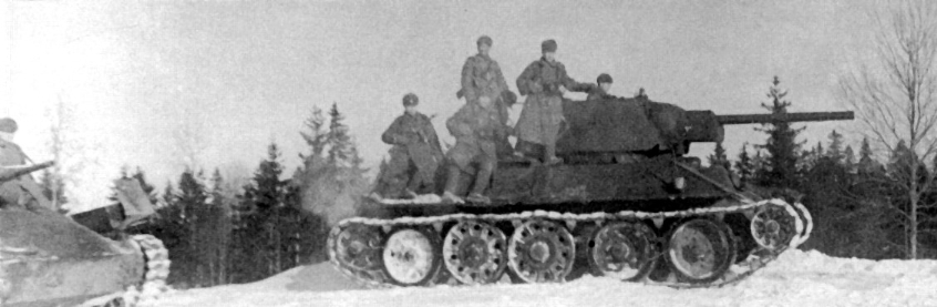 1944年2月,行驶在雪地上的两辆T-34/76坦克