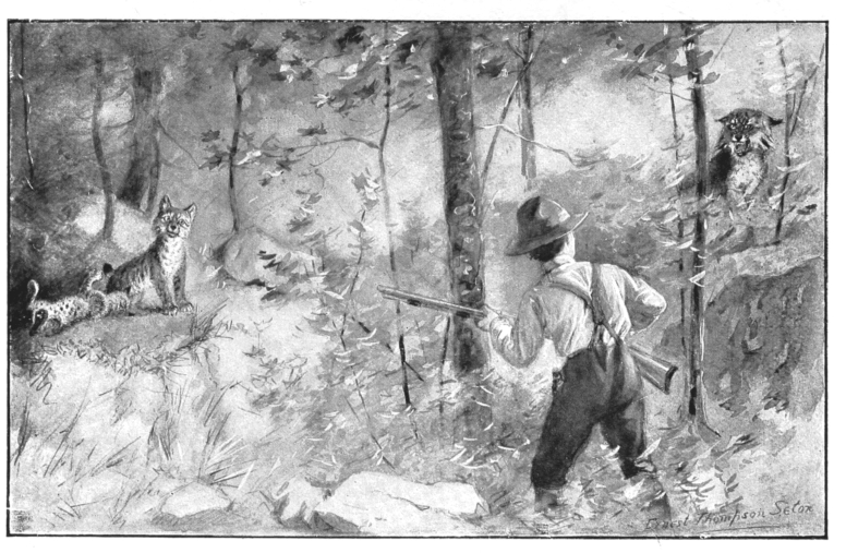 凑巧的是,就在半个小时后,索伯恩又遇见了猞猁。当时索伯恩已经跨过了木屋北面的小山,来到了那个巨大的椴树树洞所在的空地上。他突然发现地上有一只长着兔子尾巴的“小猫”,那东西也正无辜地打量着他。一如既往,索伯恩举起了枪,准备射击。但是,那小东西却丝毫不惧怕或躲闪,反而歪着脑瓜儿靠近了索伯恩。这时,不知从哪儿又跑出了一只,和前面的那只玩耍了起来。它用爪子拍了拍自己兄弟的尾巴,两只小东西翻滚在了一起。