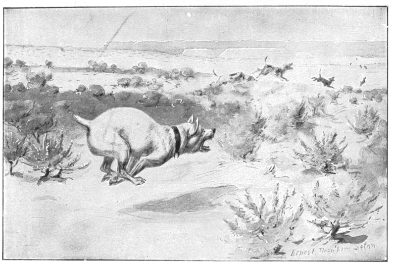 很快,狩猎队伍离开农场行进到了骷髅湾地区。突然,从北面的一片鼠尾草丛里蹿出了一只白色毛球。他飞快地向我跑来。这摇摇摆摆的、怒吼着的小东西不是别的,正是我的“暴脾气”。事已至此,不能再把他送回去了,他也不会听从命令的,即使是我的命令。“暴脾气”的伤口看起来不是很好,走起来很吃力,所以我又用马鞭把他弄到了马鞍上。