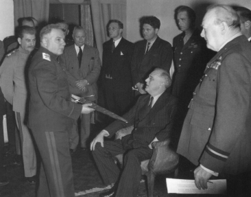 德黑兰会议期间,“斯大林格勒之剑”赠送仪式。照片上,由伏罗希洛夫元帅捧着宝剑,“三巨头”环绕在周围