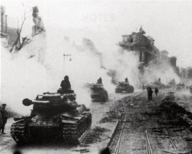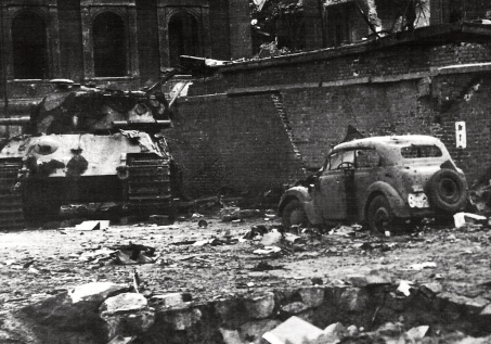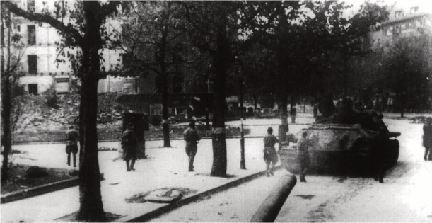 战斗异常激烈。呼啸着的火箭弹直接飞到了“诺尔兰德”师指挥所;正规军、国民突击队和希特勒青年团盘踞在阳台上、窗户边,居高临下向俄国坦克发射“铁拳”,或以猛烈的机枪扫射封锁苏联步兵的去路;“虎王”坦克分散开来到处流动,不时从街角冲出来,打掉苏军的领队坦克破坏其进攻。可崔可夫依然以坚定的步伐推进。此前,配合他的近卫第1坦克集团军排成长队沿着大街推进,可一旦第一辆坦克被“铁拳”摧毁,后面的坦克就被堵住前路乱成一团,德国人趁机射击这些坦克的薄弱侧甲。苏军因此损失了很多坦克。