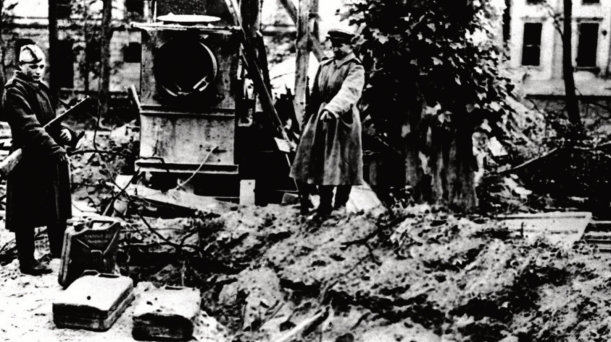 苏联士兵站在挖出希特勒尸骸的弹坑旁