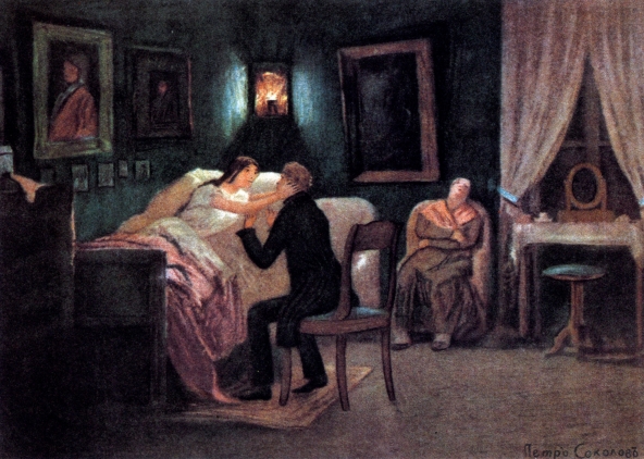 说到这里,医生把身体向前凑近些,皱着眉毛说道:“她们所以和那些邻人合不来的缘故,因为穷人她们自然不去相交,而富人方面那种傲气又禁阻她们互相亲近。所以这家人却是很有学问的,实在为我所敬佩。她服药都经我亲手灌送,我扶着她抬起身来,服了药望了我一眼,我的心不由得摇荡了。但是她的身体却一天不如一天,一定是要死的了。她的母亲、姊妹都看着我,监视着我,有点不信我了,问我她的病到底怎样,那时候我恨不得自己躺在棺材里去,嘴里也只得说道:‘不要紧,不要紧!’有一天晚上,我又一个人坐在病人旁边。丫头也在那里坐着,却纳头睡着,兀自打鼾。这也不能怪她,因为她实在困乏极了。这一晚上阿丽克珊德拉·安得丽芙娜很不好,热使她受罪。中夜以前她十分闷躁,以后睡熟了,一动不动地躺着。灯儿在屋隅的神像前点着。我坐在那里,也垂着头,打起盹儿来。忽然感觉有人在推我的背,我回身一看,原来阿丽克珊德拉·安得丽芙娜正张着眼睛望我。她的嘴唇也开了,双颊也涨得绯红。我问道:‘你觉得怎么样?’她道:‘医生,我不快死了吗?’我道:‘那怎么会呢!’她道:‘不,不要说我会活。我的情形请你不要隐瞒。’她说到这里,呼吸异常急促,又说道:‘如果我确实知道我应该死,那么,我可以把所有事情全对你说,对你说。’我道:‘你安心一点吧!’她道:‘我并没有睡着,我早就看着你了。我相信你是个好人,你是个正经人,请你说真话。你知道这件事情于我是很重要的呀!医生,我是在危险中吗?’我道:‘叫我对你说什么话呢?请你安心着吧。’她道:‘我哀求你,对我说了吧。’我道:‘阿丽克珊德拉·安得丽芙娜,我不再瞒你了。你实在是在危险之中,但是上帝施恩……’她道:‘我要死了,我要死了……’她仿佛十分喜欢,脸上也露出高兴的神情,我不由得害怕起来。她忽然撑着手肘,坐起来,说道:‘不要害怕,不要害怕,死一点也不能使我恐怖。现在我对你说,我全心感谢你,你是个好人,我极爱你。’我看着她,好像疯子似的,我心里异常的害怕。她又说道:‘你听见了没有?我爱你呀!’我道:‘阿丽克珊德拉·安得丽芙娜,我做了什么事情,承你这般……’她道:‘不不,你不明白我的意思……’说到这里,她伸出手,来拉着我的头,和我接吻。那时候我几乎喊出来,赶紧跪在她床前,把头藏在枕头上。她一句话也不说,她的手指按在我的头上,正在那里哆嗦。我听见她哭了,我要安慰她,可是实在也不知道怎么说。我说道:‘怎样,你要把丫头惊醒了。感谢你,请你安心。’她道:‘唔,得啦得啦!随便她们醒也好,走过来也好,那全是一样的,因为我一样要死了。你害怕些什么?抬起你的头来。或者你不爱我吗?也许我受了骗,那么请你饶恕我吧!’我道:‘你说什么?我爱你呢。’她直望着我,张着手对我说道:‘那么,你拥抱我呀。’老实对你说,这天晚上我竟成了疯人模样。我觉得病人在毁损自己,看出她并不清醒着,明白她如果不知道自己快死,也绝不会想到我。否则活了二十五岁,就要死去,却对于任何人都未曾发生过爱情,这个于她是很难受的,所以她于失望之中,找到我了。你现在明白这个意思吗?但是她总是拉着我的手不放。我说道:‘你宽恕我,但你还须保重你自己。’她道:‘为什么?有什么可惜的?我总是要死了。如果我知道我还能活在人世,还能做体面的姑娘,我就要害羞,我实在害羞。现在却怎样呢?’我道:‘谁对你说你要死呢?’她道:‘唔,你不要骗我,你不要说谎。’我道:‘你一定会活的,我能够医治好你,我们请求你母亲的祝福。我们结为配偶,我们将要安享幸福。’她道:‘不,不,我已经得着你那句话,我快要死了。你已经告诉我了。’那时候我真是忧愁,许多原因使我异常忧愁。你也知道一个人有时会出这类事的:表面上并没有什么,可是心里非常的痛苦。她忽然想起问我叫什么名字,不是姓却是名字。也真是不幸,人家叫我得律芬,是得律芬·伊凡尼奇。这家人家全叫我医生。我不得已便说道:‘小姐,我名得律芬。’她皱了皱眉,摇摇头,轻轻说几句法国话。也许说的是不好的话,后来便笑了。那天我全夜伴着她,早晨才迷迷惘惘地走出来,茶后又走进她的卧室里去。哎哟!哎哟!那时候她的神气已经有点不对了。老实说我不明白那时候何以竟能忍住这样难受的情况。我那病人又勉强延了三天三夜。那三夜真要命呀!她对我说了无数的话!到了最末晚上我坐在她旁边,只有求着上帝赶快把她收拾去,也把我收拾了。忽然老妇人走进屋来,头天晚上我已经对她说过,小姐是没有希望的了,最好去请牧师来。现在病人一看见了她母亲,便说道:‘唔,你来了,很好!你看,我们现在互相爱恋了。’老夫人说道:‘医生,她说什么?她说什么?’我当时就呆住了,便说道:‘她大概在那里说谵语哩。她热度很高。’可是她说道:‘得啦!你刚才对我说的是两样的话,并且还收受下我的戒指。装什么假呢?我的母亲是好人,她能够原谅,她能够明白。但是我快要死了,我还说什么谎话,请你把手给我。’我跳起身来,走出去了。老夫人大概也已经能够猜出个中的情形了。