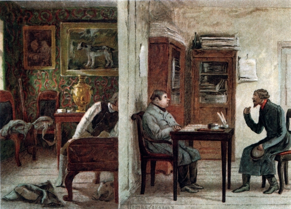 他出去了,我四面望了一下。在隔开我的屋子和经理处的板壁附近,放着一把大皮椅,屋内只有一扇窗,朝着街上,两边都安设着两把椅子,也是皮的,还有高背。在糊着绿花纸的墙上,挂着三大幅油画。一幅上画着一只带着蓝色颈圈的猎狗,上面还写着一行字:“这是我的喜悦”,狗腿旁边流着一条河,河的对岸松树底下有一只极大的兔子,耸着耳朵,坐在那里。在第二幅画上,两个老人吃着黄瓜,远远地可以看到一所希腊式的游廊,标题为“满意之庙”。在第三幅画上,画着一个斜卧的半裸体的妇人,膝盖是红的,脚踵是很厚的。我的狗竟毫不逗留,很用力地钻到椅子底下去,想来在那里找到了许多灰尘,所以大打起喷嚏来。我走到窗户那里,看见街上从田主住宅到经理处那里放着几块木板,那是极有益处的一种准备,因为俄国是黑土的田地,并且时常下雨,所以污泥很多。在街后田主住宅的附近,穿着变色的绣花衣裳的姑娘们来回走着,仆人在污泥里走一下,忽然站住了,很发愁地搔自己的背脊;警官的马懒洋洋地摇着尾巴,高抬着头,啃嚼着围墙;母鸡咯咯地叫着;生病的火鸡不住地叫着。在黑暗的、朽坏的、仿佛浴室似的建筑物的台阶上面,坐着一个粗拙的少年人,拉着弦琴,唱起有名的情歌来: