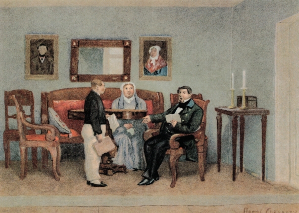 贝内佛仑斯基先生来后的第二天,塔第雅娜·鲍丽索芙娜在喝茶以后, 吩咐侄儿拿出自己的画给客人看一看。