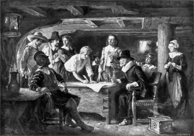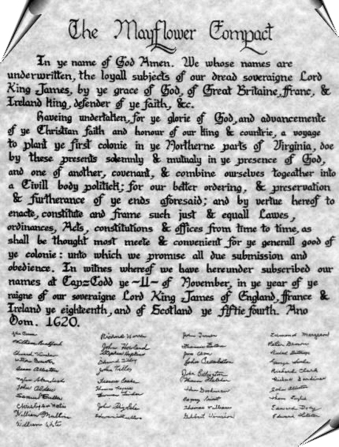 经过65天的海上颠簸与艰辛,他们终于看到了陆地,但那是离目的地稍北的科德角。考虑到已经是11月份,他们决定就在附近找地方定居。但鉴于该地区非弗吉尼亚公司特许地,在此立足既缺乏法律依据,又会失去公司的权利控制,于是他们觉得有必要约法三章,以确保未来社会能有序、安宁地运行。因此,在上岸前,威廉·布拉福特等领袖征求了大家的意见,起草并安排41位男性乘客签署了《五月花公约》:“为荣耀上帝、增进基督教信仰及吾王吾国之荣耀,吾等远涉重洋,来此弗吉尼亚北部创建首个殖民地。为维护秩序,谋求生存以及上述目标之实现,吾等面对上帝及众人庄严立约,结为民众自治政体;据此随时制定并颁布最适合殖民地公益之公正平等的法律、法规、法令、宪章及权职;吾等保证遵守服从之。”