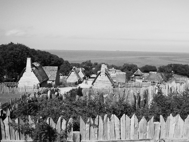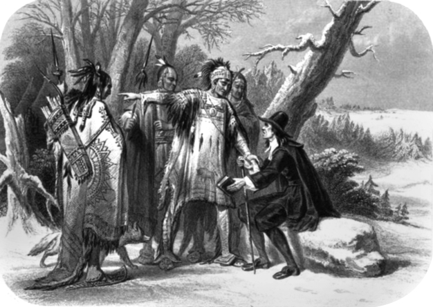 普利茅斯在清教朝圣客上岸之前是印第安人的一个村落。3年前,一场由欧洲人带来的瘟疫横扫了整个地区,几乎将印第安人全部灭绝。面对一片荒凉,严寒和饥饿很快夺走了一半人的生命,其精神上的绝望可想而知。但现实并没有让这些殖民者退缩。第一个严寒饥饿的冬天熬过去了,这得感谢万帕诺亚格印第安人,尤其是斯夸托与萨莫塞特的帮助。斯夸托之前曾被英国探险家带到英国,后又被卖到西班牙当奴隶,因此会说英语以及一点西班牙语。他作为翻译,教英国移民种植玉米、猎取动物、搭建房舍、采集海鲜。布拉福特在《普利茅斯拓殖记》中将印第安人描写成“野人”,代表了当时欧洲白人对印第安人的普遍看法。事实上,多亏这些“野人”,殖民者才能侥幸活到第二个冬天。当然,这些清教朝圣客还是与詹姆斯敦殖民者不同,他们知道感恩,对印第安人也比较友好。1621年秋收之后,他们邀请印第安人共庆丰收,感谢印第安人帮助他们渡过难关,这就是历史上的第一个“感恩节”。