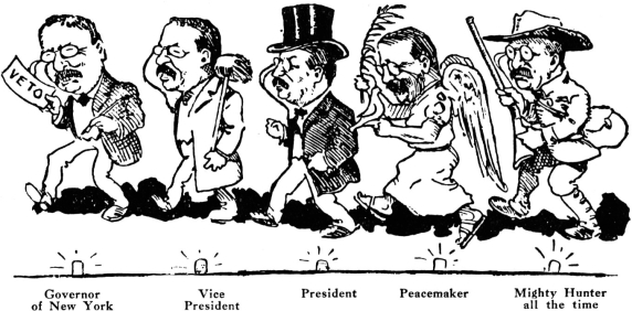 这张1910年的漫画描绘了罗斯福1899年到1910年间的形象:从纽约州长到副总统,到总统,再到和平使者,最后一张说的是他一生都是个厉害的狩猎者。