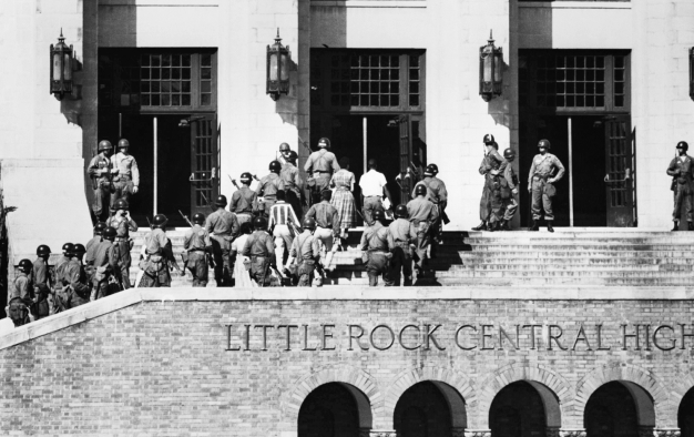 1957年9月25日上午9点25分,9位黑人学生,别称“小石城9人”,受到排着整齐队列的伞兵们的一路护送,沿台阶步入校园。其中一人明尼吉恩·布朗后来在日记中写道:“我活了这么大,头一次感觉到自己是位美国公民。”